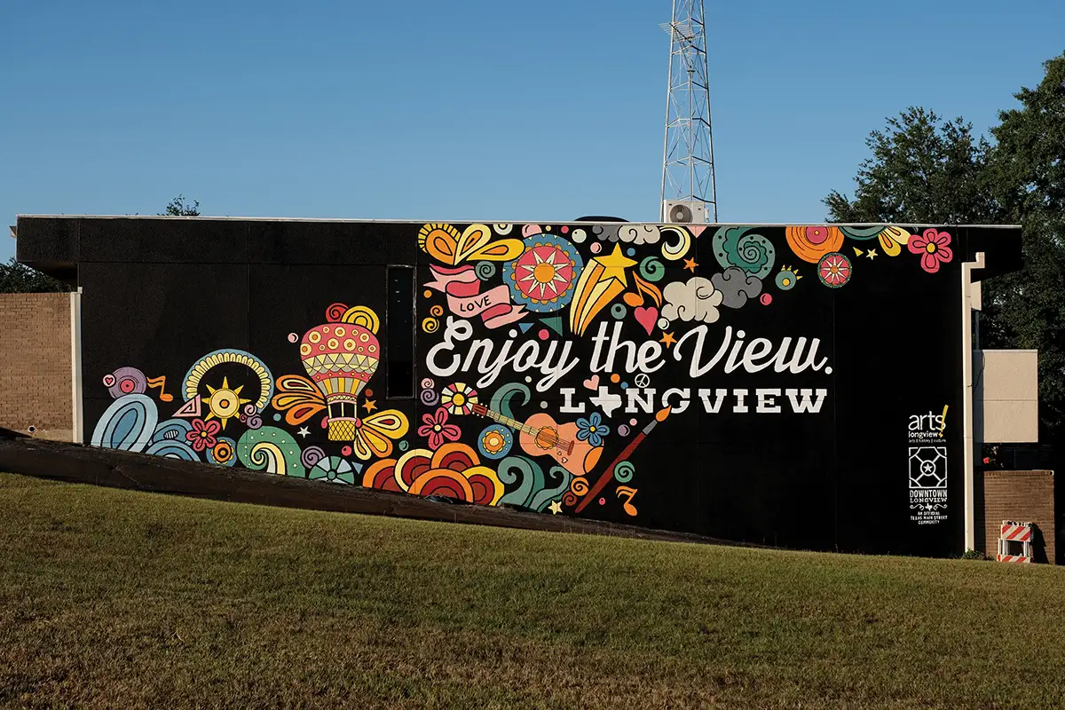 Originally planned to be painted on a different wall, when plans changed, it was determined that The Lab on Center was an ideal location. The Lab is located next to the area known as “Rock Hill,” where Longview derived its name as city founder O.H. Methvin observed the beautiful view from Rock Hill.