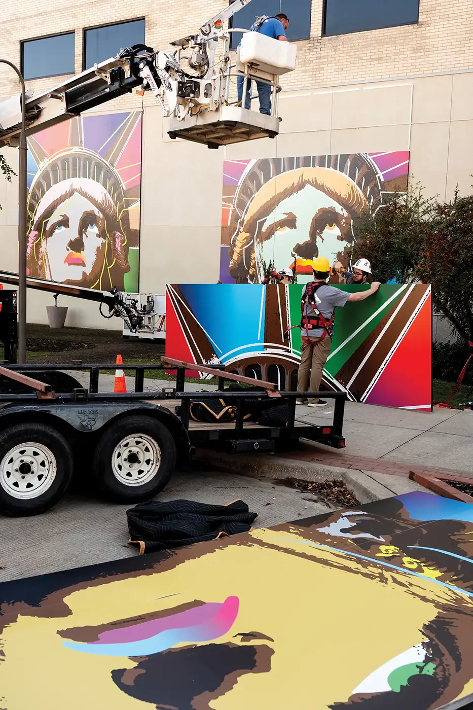 The center mural features a reproduction of Butler’s original “Colorful Lady” screen print. The left and right murals were color manipulated to create an Andy Warhol-like effect. Each mural is 17 feet tall by 17 feet wide. The murals were fabricated and installed by Leon’s Signs of Tyler.