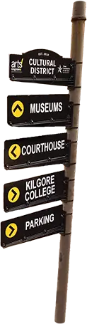 In 2024, Arts!Longview wrapped up a state-funded project to install new wayfinding signage throughout the Cultural District. The signs, which were a partnership with the City of Longview, were designed to help residents and tourists find key locations throughout the Cultural District and Downtown Longview.