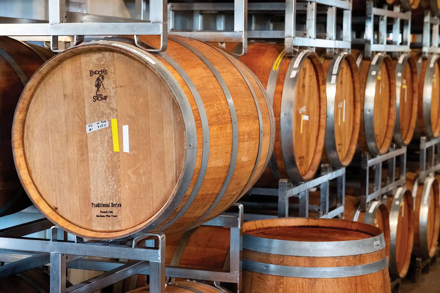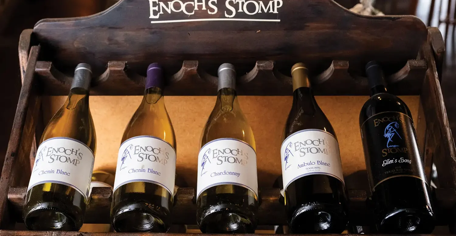 “There’s always a new experience around the corner,” says Rolf Kotulla, wine ambassador and assistant winemaker at Enoch’s Stomp. “You never know what you’re going to find.” Founded in 2004 by Altus Koegelenberg and Jon Kral, the winery sits on about 90 acres of land, including 12 acres of vineyards. Enoch’s Stomp produces more than 70 different wines, many of which are crafted from grapes uniquely suited to the humid East Texas climate. “We’re not trying to be Napa,” Kotulla explained. “We’re making wines that work here, that tell the story of this region.” The approach is both old-world and forward-thinking. Barrels line the walls, each one carefully tracked and tasted every few months. Production is constant and cyclical. Grapes that don’t tolerate the East Texas climate arrive from other parts of the state and nation to produce certain types of wine. Meanwhile, estate-grown varieties like Champanel and Black Spanish (Lenoir) anchor fan favorite wines, such as Potter’s Hand, Enoch’s Stomp’s most popular wine. Sweet and unmistakably Southern, Potter’s Hand reflects the regional taste of East Texas. “The South is a sweet-wine region. That’s not a flaw,” Kotulla said. “It’s a preference.” But sweetness is only part of the story. Award-winning dry wines, experimental releases from newly developed grape cultivars, and barrel-aged selections speak to the winery’s technical rigor. Kotulla, trained in both winemaking and formal wine education, emphasizes that wine at Enoch’s Stomp is meant to be understood but never to be intimidating. Beyond the glass, Enoch’s Stomp offers multiple experiences. Guests can opt for casual tastings and vineyard views at the Barrels Tasting Room. The Tasting Room features a casual, creative menu of pizzas, sandwiches, and salads made from fresh ingredients. For a more formal experience, guests can reserve a table at Corks Fine Dining where Chef Matt Hamilton delights patrons with an ever-changing menu of elevated cuisine to be paired with estate wines. Meanwhile, the Enoch’s Stomp Wine Club invites members to experience a blend of wine, dining, and friendship. Free to join, Wine Club members must agree to purchase at least three bottles of wine quarterly from Enoch’s Stomp. Members get together to receive their wine bottles at quarterly themed pick-up parties where they have the opportunity to enjoy food and wine pairings. On-site villas provide opportunities for out-of-town guests and local staycations. With no TVs or technology in the villas, the spaces are meant to allow guests to unplug, unwind, and reconnect.