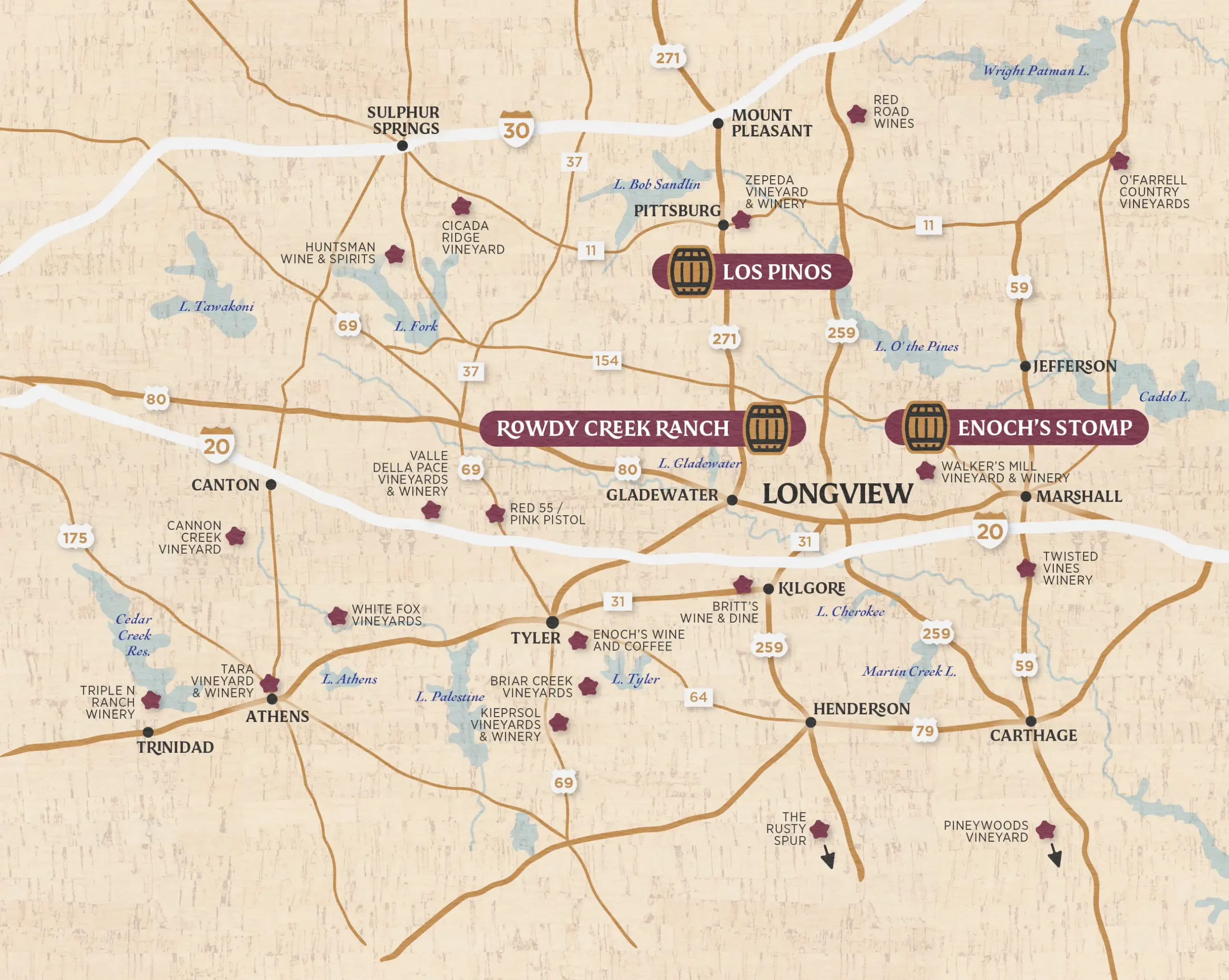 Surrounding Longview, a trio of wineries — Enoch’s Stomp Vineyard & Winery, Los Pinos Ranch Vineyards, and Rowdy Creek Ranch — anchor a growing destination for wine lovers.